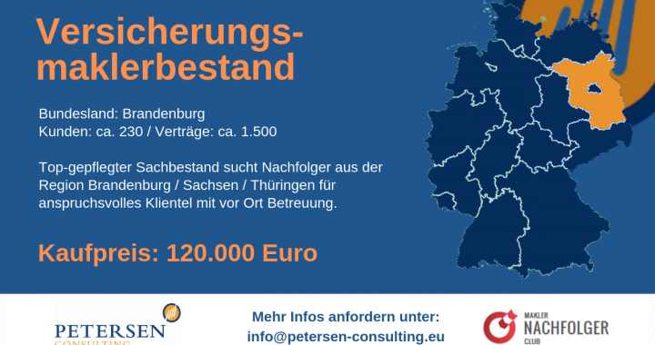 Top-gepflegter Sachversicherungsbestand im gehobenen Kundenklientel sucht geeigneten Nachfolger, der eine Betreuung der ca. 1.500 Versicherungsverträge vor Ort sicherstellen kann.
